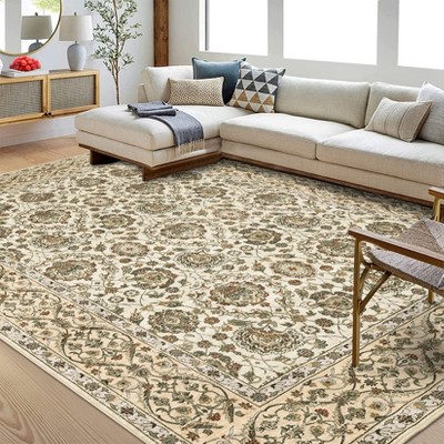 Washable 8x10 Rug, Non-Slip Soft Beige Floral Rugs for Living Room, Ultra-Thin Large Bedroom Rug, Botanical Area Rug Floor Carpet for Dining Table