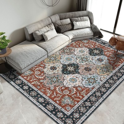 Washable Area Rug Distressed Geometric Printed Boho Rug Non-Slip Low Pile Area Rugs for Living Room Bedroom, 2'x6'