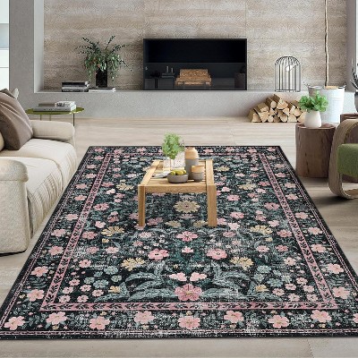 Washable Area Rugs 9x12 Non-Slip Distressed Living Room Rug, Non-Shedding Foldable Ultra-Thin Boho Indoor Floor Carpet for Dining Room, Black