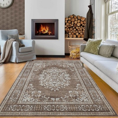 Washable Neutral Area Rug 5'x7' Boho Vintage Floral Retro Geometric Non Slip Low Pile Carpet for Living Room Bedroom, Beige Brown