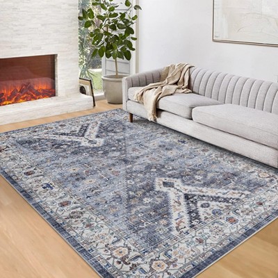 Washable Rug Area Rug Moroccan 9x12 - Ultra-Thin Non-Slip Boho Geometric Carpet Blue/White for Living & Dining