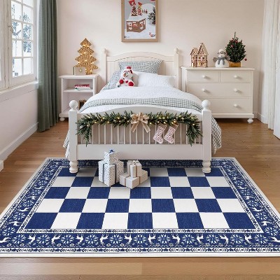 Washable Rug for Living Room 8x10 Large Blue Christmas Floor Cover,Non Shedding Low Pile