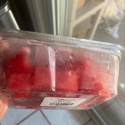 Leaky container. Broken seal and half of watermelon missing.