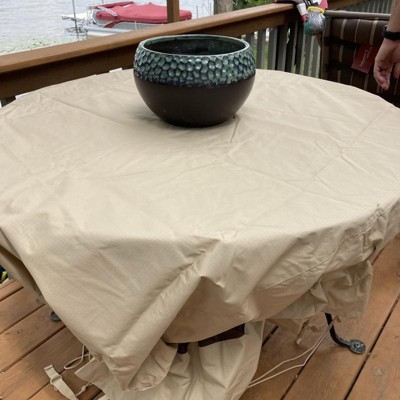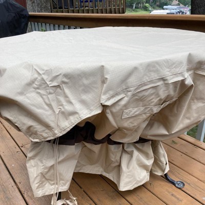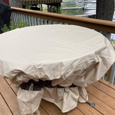 [This review was collected as part of a promotion.] I picked up this weatherproof cover for our outdoor round dining table that we have for our patio set. We have this in the color tan and it helps keep the patio table out of the Elements and repels the rain. This cover works really well and does a great job. It has places where you can tighten the cover around the table and feels very secure when it’s on. It has not budged when the wind has been strong. I received an incentive to write this review.