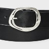 Complete your chic looks with this Wavy Center Buckle Belt from A New Day™. Featuring a smooth exterior with subtle textured detailing, this belt with a medium-width profile features a wavy center metal buckle for unique, fashionable appeal. It's fitted with multiple holes for an adjustable, secure fit around your waist, and the solid color pairs well with both casual or dressy outfits.