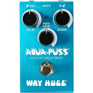 The Aqua-Puss Analog Delay is famous for its bright, jangly repeats and wonderfully straightforward operation. Now, all of that wholesome goodness comes in a Way Huge Electronics Smalls housing that pedalboard will love for. With 20ms to 300ms of delay time on tap, this pedal is all about tone-thickening and old school slap-back. The Feedback control regulates delay duration and intensity, but beware! Extreme settings are known to throw this pedal into wild, space-and-time-warping self-oscillation. Use the Blend knob to set a balance between dry and delay signals, from mild to wild! The Aqua-Puss Analog Delay is a must for players who want to add a little depth to their tone or conjure up some slap-back sweet enough to earn the envy of any rockabilly or country legend.