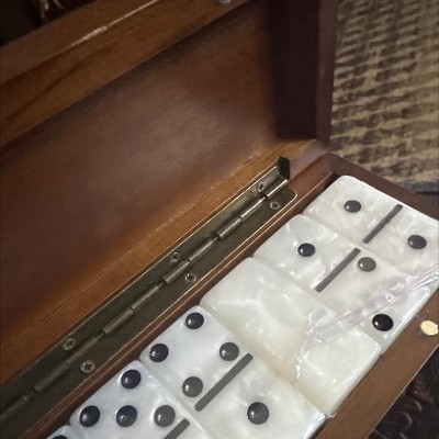 The term marbleized is misleading. There is a design that represents some sort of marble pattern. However, the domino is plastic had I known I was paying for the wood box with plastic dominoes, I probably wouldn’t have spent as much but the box is great despite the little chip on the front.. The listing does say plastic if you look further down into the specific definitions, however I do feel that the word marbleized is misleading and wouldn’t have purchased if plastic had been used in the description