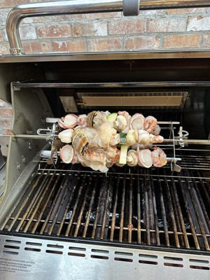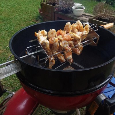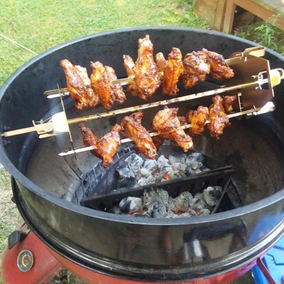 The Weber rotisserie skewer set is well made with a simple, clever designed. No flipping, no sticking, even cooking all the way around. Using on a pellet grill is a "set it and forget it". It also works great for chicken wings. I also like the rotisserie basket for wings. I have enjoyed having both! Also love my Searwood XL600!