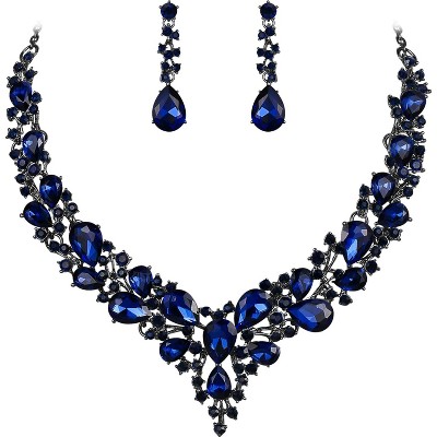 SmallRig Wedding Bridal Jewelry Set, Austrian Crystal Teardrop Cluster Necklace & Earrings 07-Navy Blue Black-Tone