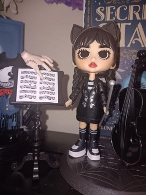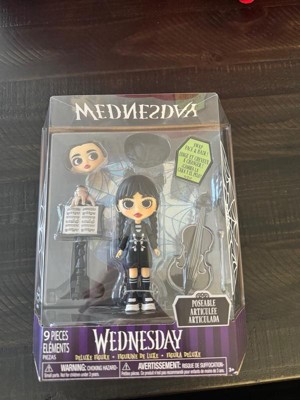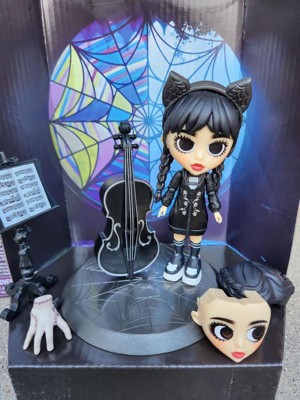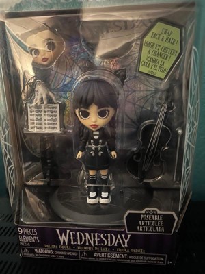 - Includes: Wednesday articulated figure, 2 interchangeable face plates, 2 interchangeable hairstyles, cello, cello bow, music stand, cat-ear headband, Thing figure, and figure base.