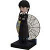 WEDNESDAY BOBBLEHEAD: This bobblehead by Royal Bobbles features Wednesday Addams in front of the stained glass window. This collectible figurine portrays Wednesday Addams in front of a stained glass window, adding a unique touch to any fan's collection.