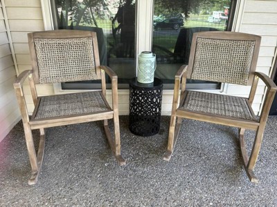 When you think of cozy front porch decor for farmhouse or countryside aesthetics, rocking chairs are an iconic staple that comes to mind. Featuring a gorgeous acacia wood frame and a rustic-inspired faux wicker weave, our rocking chair brings both incredible comfort and a homey vibe to your outdoor space. This chair is finished with a gentle rocking design that creates a soothing motion for you to enjoy, making this chair your new favorite place to sit back and enjoy the outdoors.