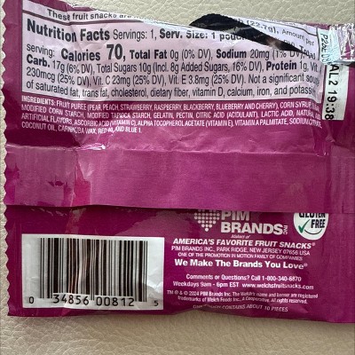 whole fruit puree (grape, peach, strawberry, raspberry, blackberry, blueberry and cherry), corn syrup, sugar, modified corn starch, gelatin, citric acid (acidulant), lactic acid, natural and artificial flavors, ascorbic acid (vitamin c), alpha tocopherol acetate (vitamin e), vitamin a palmitate, carnauba wax, annatto (color), turmeric (color), and fruit and vegetable juice (color).