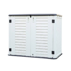 This storage shed is designed for easy anchoring to the ground and features a concave and convex roof to help rainwater flow off, preventing damage. It includes a dedicated location for laminate shelving (shelf not included) and is perfect for storing a variety of items such as garden tools, BBQ grills, firewood, and more. The lockable lid ensures added security for your stored items.