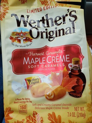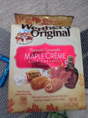 [This review was collected as part of a promotion.] Werther's Original Soft Maple Crème Caramels, 7.4 oz bag are very good. The caramel is soft, the maple creme has a good maple flavor and melts in your mouth. The candy is buttery, soft and sweet. Hard to eat just one! Good quality and fun to have on hand during the fall season. I like having the creme center, it makes the candy so much better. Nice sized bag.
