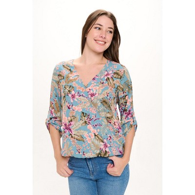 The Alexa Knit Surplice Roll tab blouse is a closet staple and favorite item at West K! This three quarter sleeve woven blouse is the perfect everyday top - it has a faux wrap in the front creating a flattering v-neckline and tabs at the sleeve to add an elevated touch. Made in USA. Material - 96% Polyester 4% Spandex. Machine washable.