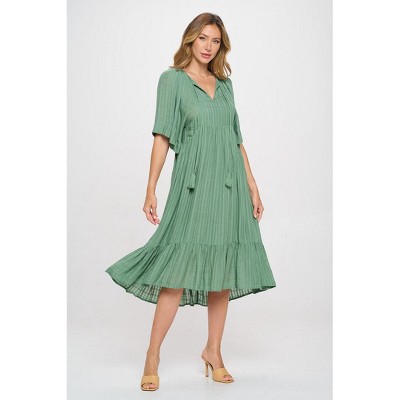 This easy and effortless Long Sleeve Tiered dress is belted, with a neckline tassel detail. The bottom tier adds feminine detail making it a perfect "all-seasons" dress. This is an easy pull-on body with the button cuff. Material - 100% Polyester. Machine washable. Imported
