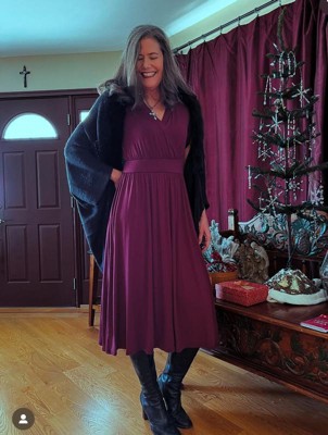 [This review was collected as part of a promotion.] This knit faux wrap midi dress is super comfortable and versatile to style. It is very flowy and can be dressed up or worn casual. The short flutter sleeves are just the right length and so slimming.