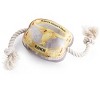 Bring a taste of the ranch to your pup’s toy collection with the Western Belt Buckle! Featuring a shiny foil effect with gold and silver details, this buckle is as glamorous as it is fun. Gold embroidery on the back reads "Haute Diggity Dog Ranch," while the strong rope sides make it perfect for tug-of-war sessions. With a squeaker, crackle, and reinforced mesh lining, this stylish toy is built tough for every rodeo-ready pup!