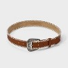 A: The belt features a buckle closure for secure fastening.