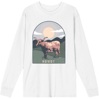 Explore the rustic charm of the countryside with this delightful apparel featuring a serene image of a cow in a sunlit grassy field. Bold white letters spell out "Howdy" at the bottom, adding a touch of Western flair. Crafted from premium materials, this garment ensures both comfort and durability. Easy care instructions include cold machine washing with like colors and tumble drying on low heat, keeping it fresh and vibrant.
