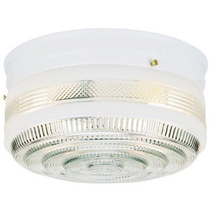 This Westinghouse Two-Light Flush-Mount Interior Ceiling Fixture offers a basic, functional look. The fixture features a white finish with white glass bands and clear glass that is highlighted with texturing and ribbed concentric circles on the bottom. This indoor fixture is ideal for attics, pantries, closets, laundry rooms, and other interior areas. It measures 5-1/4 inches high by 10-3/4 inches in diameter. It uses two medium-base light bulbs, 75-watt maximum (not included). The fixture is ETL/CETL listed for safety and is backed by a five-year limited manufacturer's warranty against defects in materials and workmanship. Product reference number 66238.