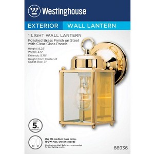 This Westinghouse One-Light Exterior Wall Lantern features a handsome polished brass finish and clear glass panels. The clean lines and simple shape offer a traditional look that goes well with most architectural styles. The lantern mounts securely to any exterior wall and is ideal for entryways, porches and decks.