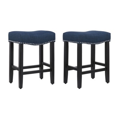Enjoy a refreshing update to your home bar with this modern bar stool. The saddle-style seat delivers stylish comfort for your kitchen or bar area. Plus, it boasts a backless design and a convenient footrest for added comfort. The upholstered seat is foam-filled for cushioning and has a subtle silver nail head trim for a modern touch on a traditional silhouette.