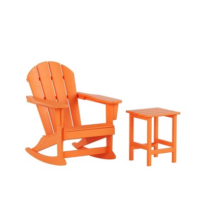 - Set Includes: Two (2) Adirondack rocking chairs, One (1) side table