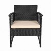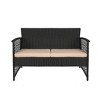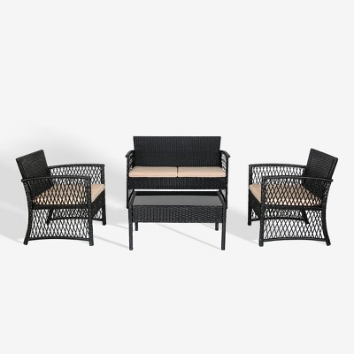 Turn your backyard into a place of style,comfort, and conversation space with this beautiful 4-piece woven rattan wicker and coffee table conversation set. The entire set is wrapped in a beautiful black woven rattan wicker that is made up of PE material that adds durability and strength to the set and with a UV and weather resistant coating that prevents fading and keeps the set in prime condition. The beige padded cushion covers are made of a polyester blend that is both an all-weather fabric and fade resistant, so they keep your furniture looking good all year long. This is the perfect set to make your backyard the place to be.