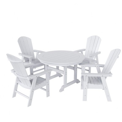 Designed for outdoor dining and entertaining, this 5-Piece Outdoor Dining Set comfortably seats up to four people. The all-weather set includes curved-back dining chairs inspired by modern Adirondack styling for added comfort and support. A spacious round dining table provides ample surface space for everyday meals and gatherings. Constructed from durable HDPE material, the set is UV- and weather-resistant for reliable outdoor use. The table and chairs feature a wood-look finish and are designed to resist splintering, cracking, and peeling for long-lasting performance.