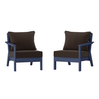Relax by the poolside or on your patio under the stars with our charming set of two Modern Outdoor Club Chairs with Deep Seating Cushions. lounge back in bliss with the deep inclined seat rest and the slanted backrest that offers a relaxing design. our outdoor club armchair is a perfect blend of comfort and design with the durable and thick HDPE material that ensures a stable design. turn your backyard into an oasis with this patio sofa chair this season.
