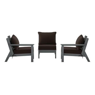 Set Includes: one (1) deep seating left arm club chair, one (1) deep seating armless club chair, one (1) deep seating right arm club chair, and three (3) deep seating cushion sets