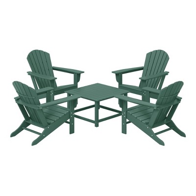 Gather around with your loved ones around our charming 5-piece Adirondack conversation set. Crafted with a durable HDPE all-weather material that is perfect for the outdoors with its resistance to UV and fading. Comfortable chairs with spacious armrest and deep reclined seats to help relieve tension on your lower half and combined with the wide 30" square coffee table that provides plenty of space for all your drinks and a center umbrella hole that can fit 1.5" umbrella poles for added shade.