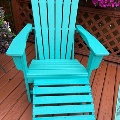 Sit back, relax, and catch a tan or enjoy some family time on this stunningly crafted 2-piece Adirondack chair with ottoman set. Designed with comfort and style in mind, it features an ottoman for your feet and a broad armrest for extra armroom; a seashell design and curved reclined backrest for a more comfortable seat; and a high back for superior back support that lessens spinal tension. Constructed from a durable and solid HDPE material that is weather resistant and, unlike wood, won't rot, crack, chip, peel, or splinter. A UV-protective coating prevents fading, keeping the colors vibrant and amazing all year long. These attractive chairs are easy to clean, making it perfect for the outdoor space and is sure to make your backyard the place to be.