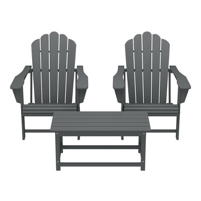 - Set Includes: Two (2) Adirondack Chairs with Cup Holder, Two (2) Folding Ottomans, One (1) Patio Side Table
