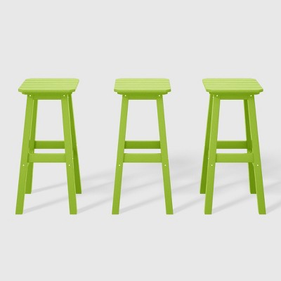 This set of two 29" backless bar stools presents a sophisticated addition to your outdoor patio, ideally suited for placement around your outdoor patio bar or bistro table. Crafted from durable and recycled HDPE material, its design is tailored for outdoor use, boasting UV and weather-resistant properties that safeguard the stool. Available in a palette of fade-resistant solid colors, it ensures the enduring vibrancy of its charming hue each season. The backless design makes for seamless storage underneath the table, offering both versatility and elegance. The classic yet modern aesthetic effortlessly harmonizes with your existing decor, while the A-frame design, supported by four sturdy square legs and foot bars, provides a well-balanced and comfortable seating experience.
