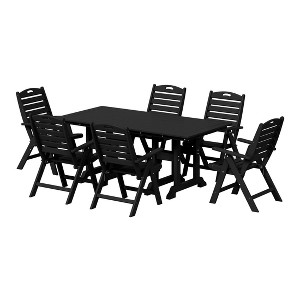 Savor every moment with our 7-Piece HDPE Adjustable High back Folding Patio Dining Table Set, designed for both style and comfort. Made with a durable, all-weather HDPE material that is resilient against UV rays and fading, making it the ideal material for the outdoors. Embrace sun-filled days with ease, thanks to a thoughtfully designed 1.9" umbrella hole—ideal for adding your favorite patio umbrella. After your meal, unwind with the adjustable backrest, offering four reclining positions for personalized relaxation. When the evening is over, effortlessly fold the chair for convenient storage, keeping your space neat and tidy. durability and stability in mind with tables trestle leg design to ensure added stability, durability and helps reduce wobbling.