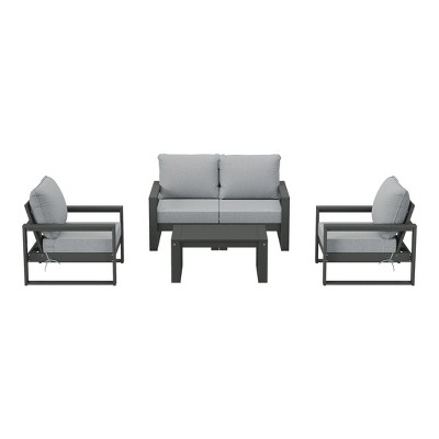Set Includes: One (1) Left Arm Facing Patio Sectional Chair with Cushions, One (1) Armless Patio Sectional Chair with Cushions, One (1) Right Arm Facing Patio Sectional Chair with Cushions, & One (2) Patio Club Chair with Cushions, and One (1) Patio Coffee Table