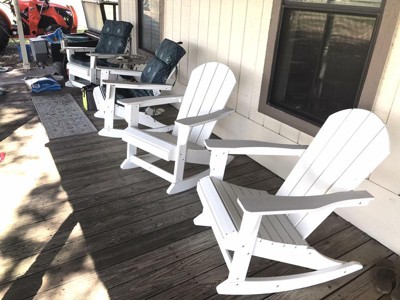 - This classic Adirondack rocking chair will make you feel like you're at the beach as you sit back and unwind in the sunshine. Weather-resistant polyethylene adds durability and fade and UV-resistant treatment prevents fading.