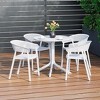 Gather with friends or family for a quick brunch on your balcony with our outdoor 5-piece dining table set with stackable resin patio dining chairs. Crafted from durable, all-weather PP resin, prepared to withstand the elements while retaining their vibrant color year-round thanks to their UV and fade-resistant properties. Lightweight and simple to move, they are perfect for creating a flexible dining area on even the smallest balconies or patios. Designed with comfort in mind, featuring a mesh backrest to keep you cool on warm summer evenings and adjustable foot levelers on the patio table to help prevent wobbling with a perforated round tabletop to help speed the drying process and prevent water from puddling on the table. And when not in use, the patio dining chairs stack neatly for easy storage for those with smaller spaces.