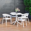 Gather with friends or family for a quick brunch on your balcony with our outdoor 5-piece dining table set with stackable resin dining chairs. Crafted from durable, all-weather PP resin, prepared to withstand the elements while retaining their vibrant color year-round thanks to their UV and fade-resistant properties. Lightweight and simple to move, they are perfect for creating a flexible dining area on even the smallest balconies or patios. Designed with comfort in mind, featuring a mesh backrest to keep you cool on warm summer evenings and adjustable foot levelers on the patio table to help prevent wobbling with a ventilated tabletop to help speed the drying process and prevent water from puddling on the table. And when not in use, the patio dining chairs stack neatly for easy storage for those with smaller spaces.