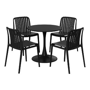 - Set Includes: One (1) 31.5" Round Patio Dining Table and Four (4) Stackable Patio Dining Side Chairs.E-Coating Finish Provides Rust & Fade Resistance To The Metal Dining Table, Ensuring Longevity & Weather Resistance In Outdoor Conditions.Chairs Constructed with Durable Polypropylene (PP) Material & Designed for Sturdiness & Stability.Robust & Thick Metal Table Base Offers Increased Stability & Wide Flat Base Bottom Helps Eliminate Wobbling.Stackable Chairs for Easy Storage & No Assembly Required, Simply Unpack & Enjoy & The Table Is Simple To Assemble.Water Easily Drains Through The Slatted Chairs Preventing Puddling & Keeps You Cool By Allowing Fresh Air To Flow Through.