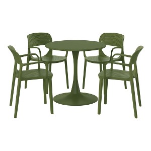 - Set Includes: One (1) 31.5" Patio Dining Table & Four (4) Stackable Patio Dining Armchairs