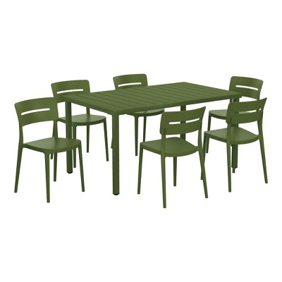 Set Includes: One (1) 59" Patio Dining Table with Metal Frame & Six (6) Stackable Plastic Patio Dining Chairs