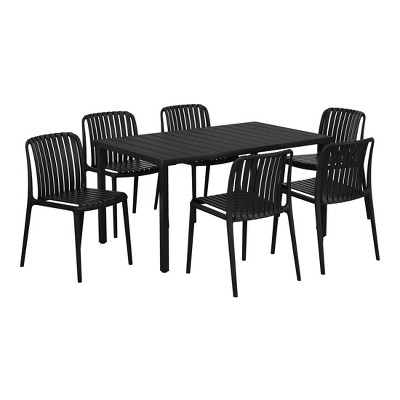 • Set Includes: One (1) 59" Iron Metal Patio Dining Table with and Six (6) Stackable Plastic Patio Dining Side Chairs