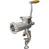 Simple Meat Grinding - Just Turn the Handle Economical hand-cranked grinder is easy to use and great for stuffing sausage, too. Just put meat in the hopper above and turn the handle - no electricity needed. Grinder clamps to table or countertop. Comes with two face plates for medium and coarse grinding (4.5 mm and 10 mm), stuffing funnel, star and flange. Heavy-duty nylon auger bearing. Tin coating. Note: Comes with a protective coat to keep the grinders safe while shipping. Thoroughly clean unit before using (instructions included).For best care: After initial first cleaning, you can use warm, soapy water for after you use grinder. Dissemble the grinder and hand wash in warm, soapy water.6-1/2"H from surface. 8-3/4"L, hopper 3" x 4"OD,