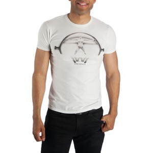 In Westworld, machinery and augmented reality rule existance. Its function is renweal and the motion of this Vitruvian Man is captured with shadows and depth. Cut in below, the shiny metal of the Westworld logo finishes up the design. A vacation of augmented reality may not await you in our current time, but you might appreciate this TV tee all the same. For the chic geek that feels good in a quality shirt, we got you covered. Using a soft hand print, the symbolic design offers dimension upon the white fabric. ?Sizes: S ? 2X
