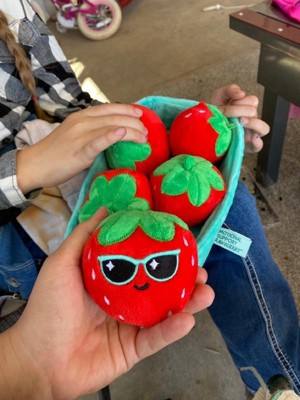- Includes 5 individual, removable plush strawberries and plush carton.