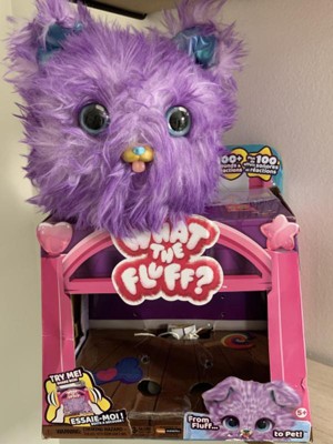 Introducing What the Fluff: fluffy interactive pets looking for their fluff-ever home! These super cute toys for kids feature over 100 exciting sounds and reactions and have a surprise pet reveal! Hidden inside a soft purple fluff is Pupper-Fluff. Play with your shy and timid What the Fluff toy to encourage her out of hiding and earn her trust. You can pet, roll, shake, toss and turn her upside down – when your fluff is feeling more comfortable, she reveals her ears! Keep playing, and her eyes will peek out, too! Once Pupper-Fluff fully trusts you, you’ll hear the celebration song and she’ll transform from fluff to pet! As you play, you’ll unlock Pupper-Fluff’s sweet and silly personality. With so many sound effects and reactions, you never know what adorable response you’ll get! This little fluff loves to eat, roll, snuggle, dance, sing and more. There are so many ways to play in both fluff and pet mode! She purrs and coos when pet, giggles and wiggles when tickled and gets dizzy if shaken. Toss your new friend in the air or turn her upside down to see her somersault! In fluff mode, feed her and scare away hiccups, play a game and more. You can even have a dance party with your What the Fluff! Tilt your pet left and right to play music and touch Pupper-Fluff’s head to hear her sing. Shake, toss and tilt your pet for even more music sounds, like a cute high note! At any time, transform your What the Fluff pet back to fluff, or change from fluff to pet again and again. For more fluffy fun, look for What the Fluff Purr ‘n Fluff (sold separately)! What the Fluff toys are perfect for pretend play and make great birthday gifts, Christmas gifts or gifts for kids aged 5 and up for any occasion. Each What the Fluff measures approximately 7 in. in diameter. Includes 3 AA batteries. Discover the sweetest surprise with What the Fluff!